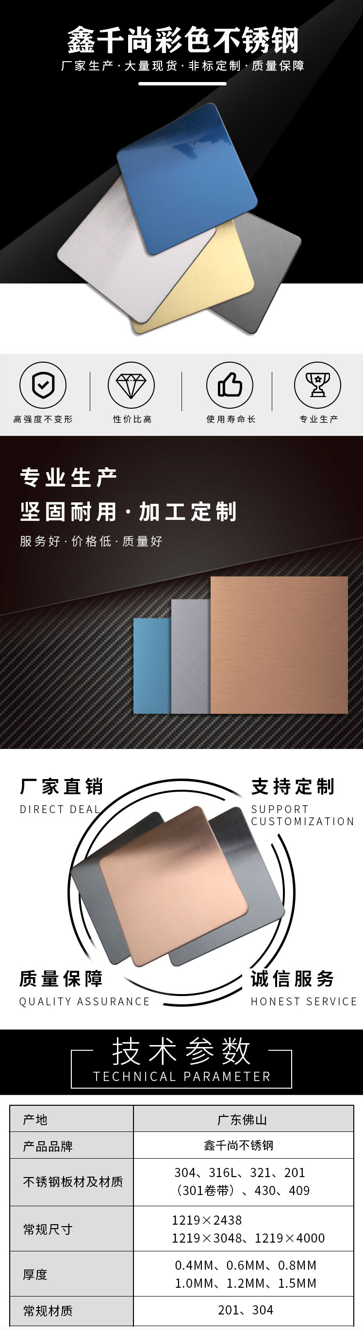 彩色不锈钢装饰板使单调的、不锈钢板变得更加丰富多彩,更有魅力,使用领域更广泛。 多年彩色不锈钢装饰板生产经验,执着先进生产工艺,从未间断钻研;不仅是工业产品,也是我们对品味的追求 彩色不锈钢板是在不锈钢板上进行技术性和艺术性加工,使其表面成为具有各种绚丽色彩的彩色不锈钢装饰板,其颜色有浅金黄,金黄,宝石蓝,黑色...