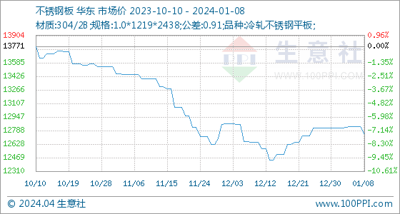 1月8日生意社不锈钢板基准价为1283571元吨